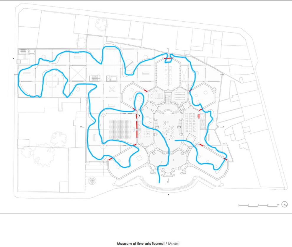 Pour cette revitalisation (destruction?) de l’œuvre de V. Horta, le squelette du Musée sera percé de pas moins 11 portes/ouvertures* à travers lambris et murs permettant un parcours fluide et complexe entre les différents points de rencontre et d’exposition (voir capture d’écran, la circulation proposée?).